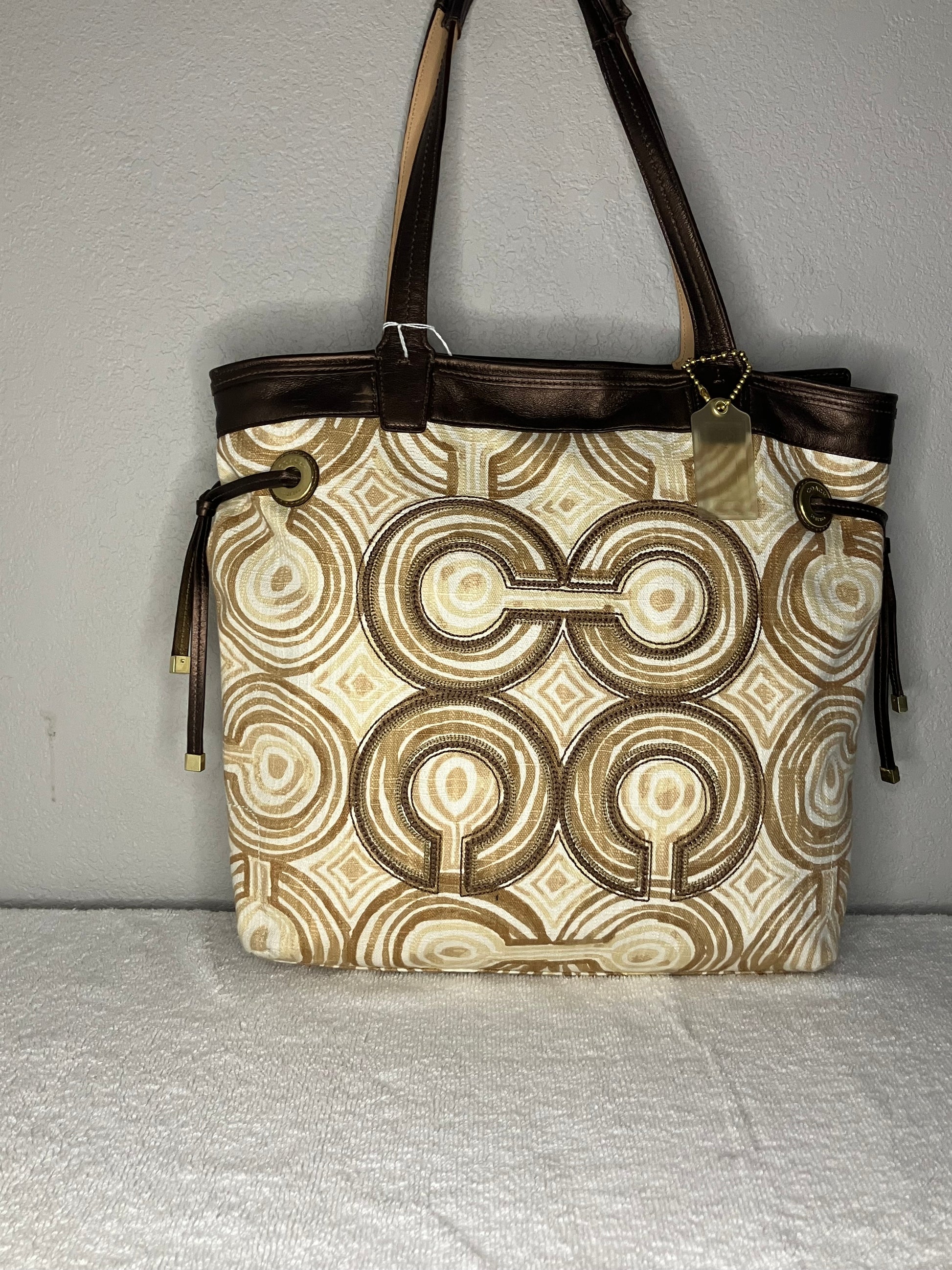 Coach Audrey Op Art Swirl Tote in Beige and Brown Signature Canvas with Bronze Leather Trim