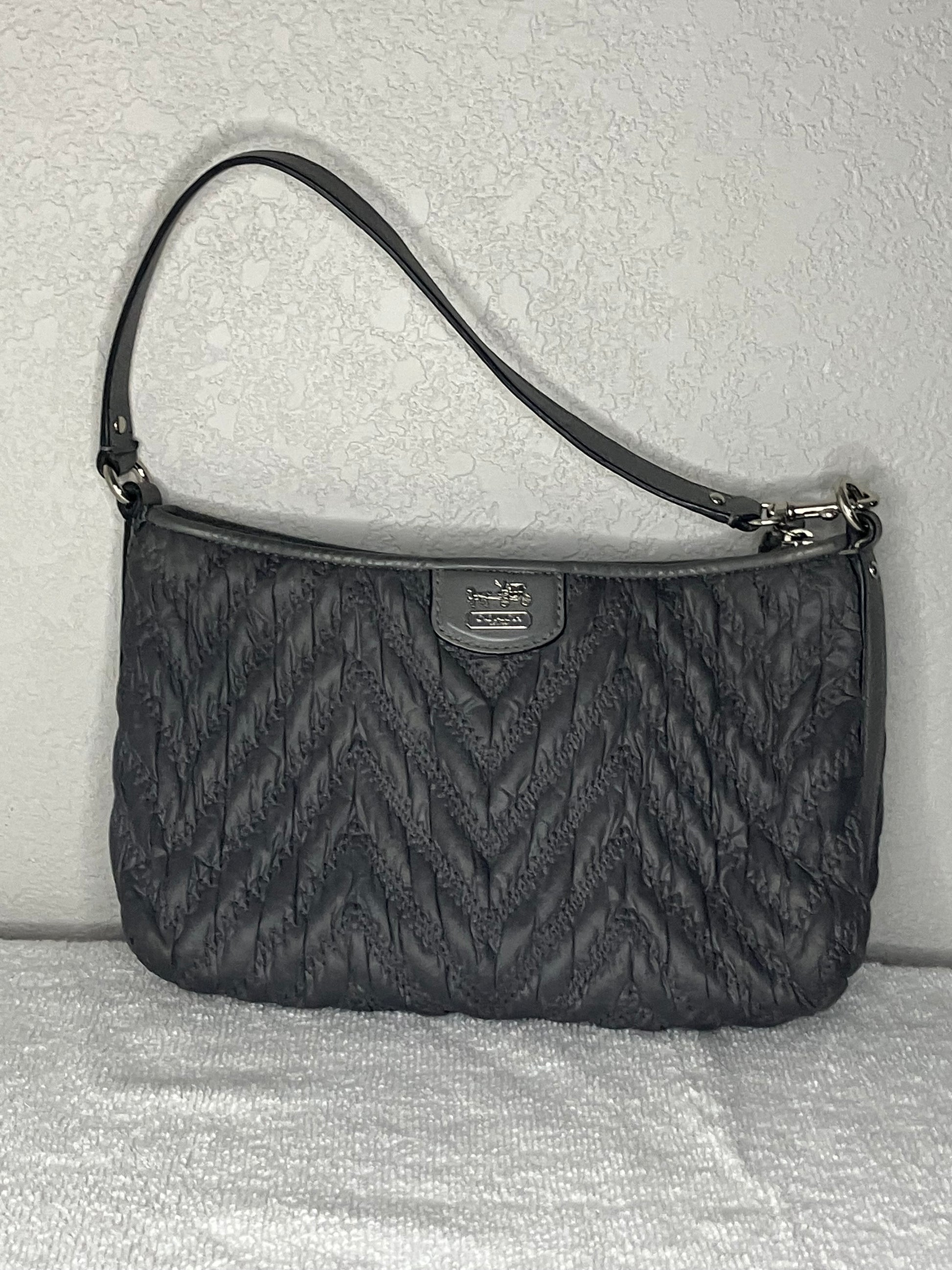 The Coach Madison Quilted Chevron Nylon Demi bag combines sophisticated design with practical function. Crafted from durable nylon with a distinctive chevron quilted pattern, this bag offers lightweight comfort and lasting wear. Its streamlined demi silhouette provides ample space for essentials while maintaining an elegant profile, perfect for daily use or special occasions. An adjustable strap allows versatile carrying options, making it a refined accessory for those who appreciate both style and utility.