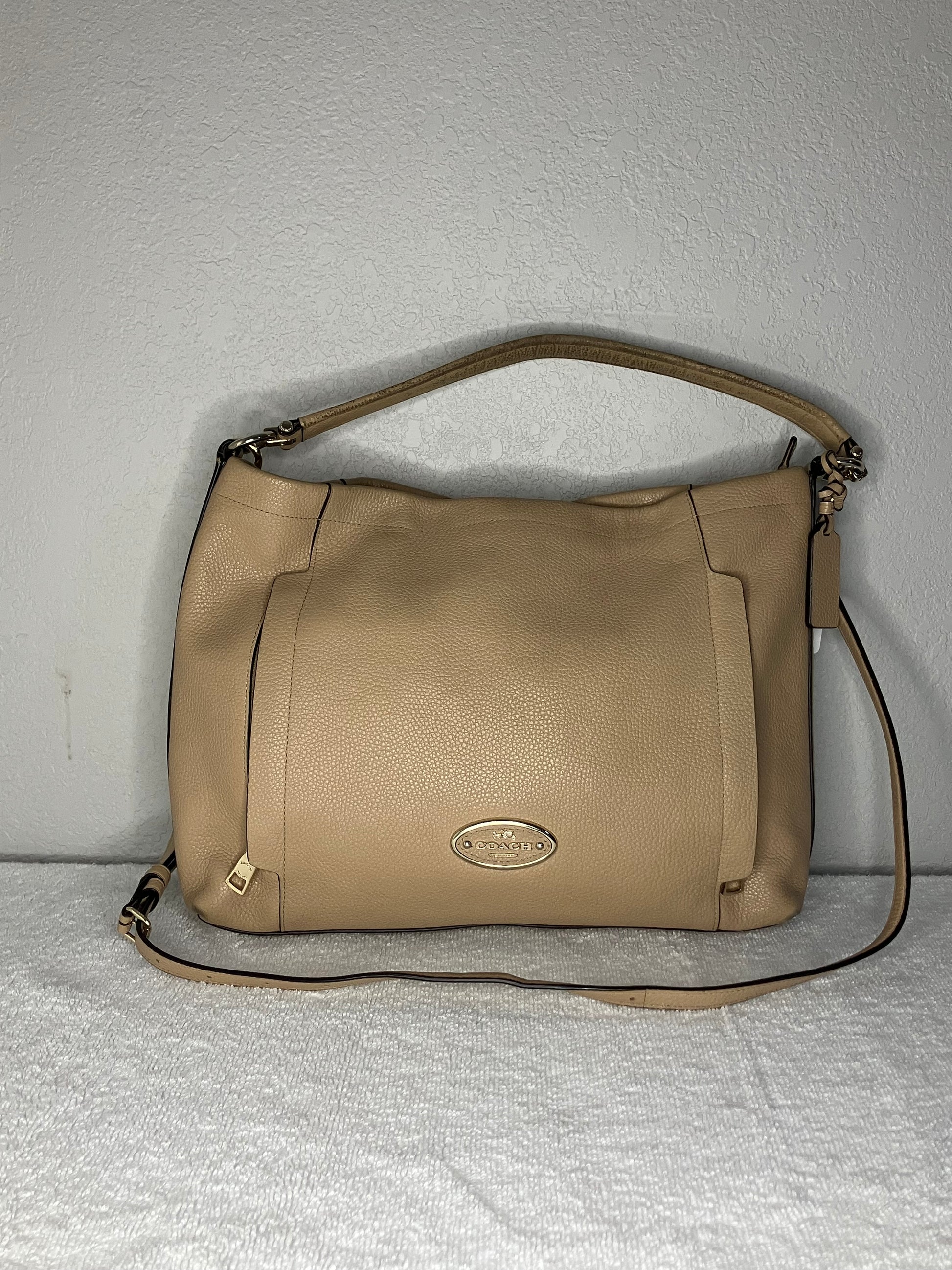 This Coach Scout Hobo shoulder bag in Pebble Leather features a classic, versatile design perfect for everyday use. Crafted from durable pebble leather, it offers a soft yet sturdy feel. Note that there is some wear on the handles and corners, which reflects its previous use but does not compromise its overall functionality. This bag provides a spacious interior and comfortable shoulder carry, making it an excellent choice for those who value both style and practicality.